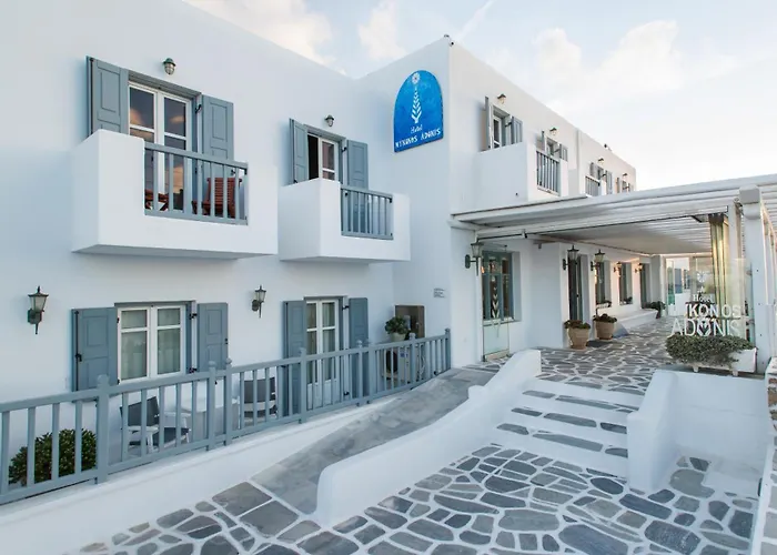 The 4-star Hotel Adonis Mykonos Town is situated within a few steps of a historical district, 6 minutes' walk from Church of Saint George and offers a sundeck, massage therapy, and a shared lounge. Located 7 km from Avenue of the Lions, this hotel features 12 rooms with views of the beach.